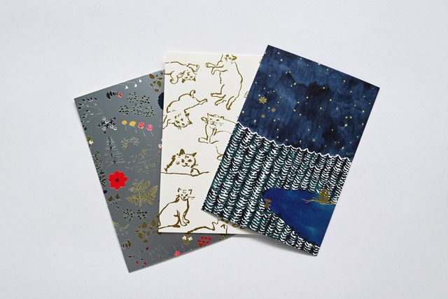 イイダ傘店のテキスタイル柄のポストカード 箔押しの特殊加工が施されたカードです。 森と夜の星空、ねこ、森の花の3柄。 (サイズ:100×148mm) 【送料について】 複数点の商品をご購入の際に、システム上送料が重複する可能性がございます。 重複が発生した際は、発送前に送料の訂正をさせていただきますのでご安心下さい。 不明点がございましたらお問い合わせ下さい。