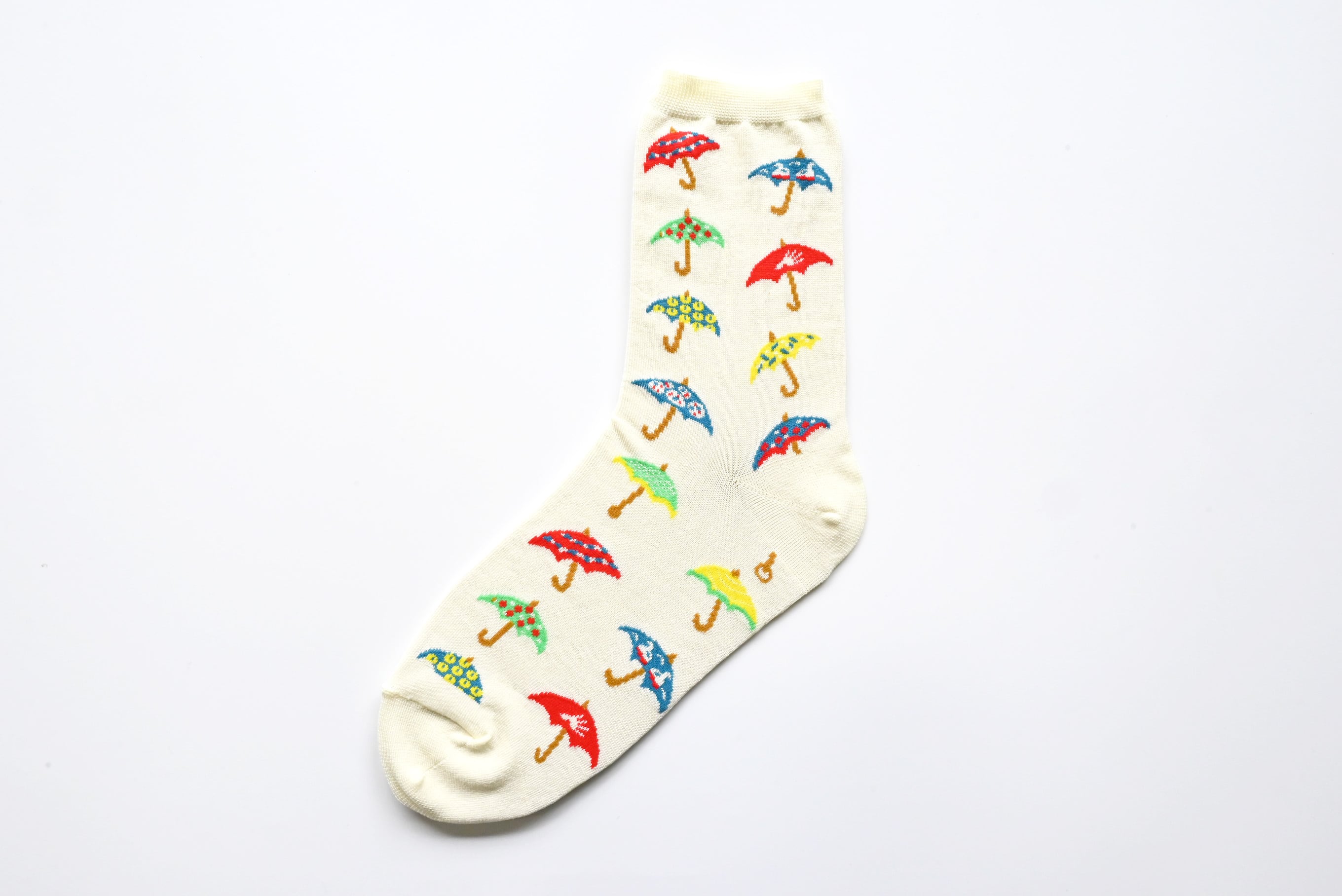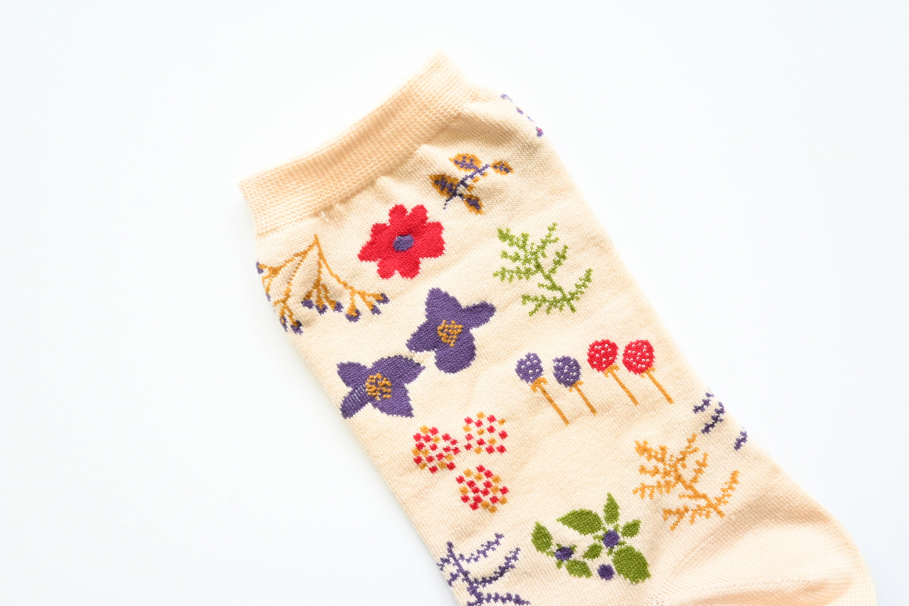 イイダ傘店のテキスタイル「トウモロコシ」と「森の花」の柄でお作りした靴下。